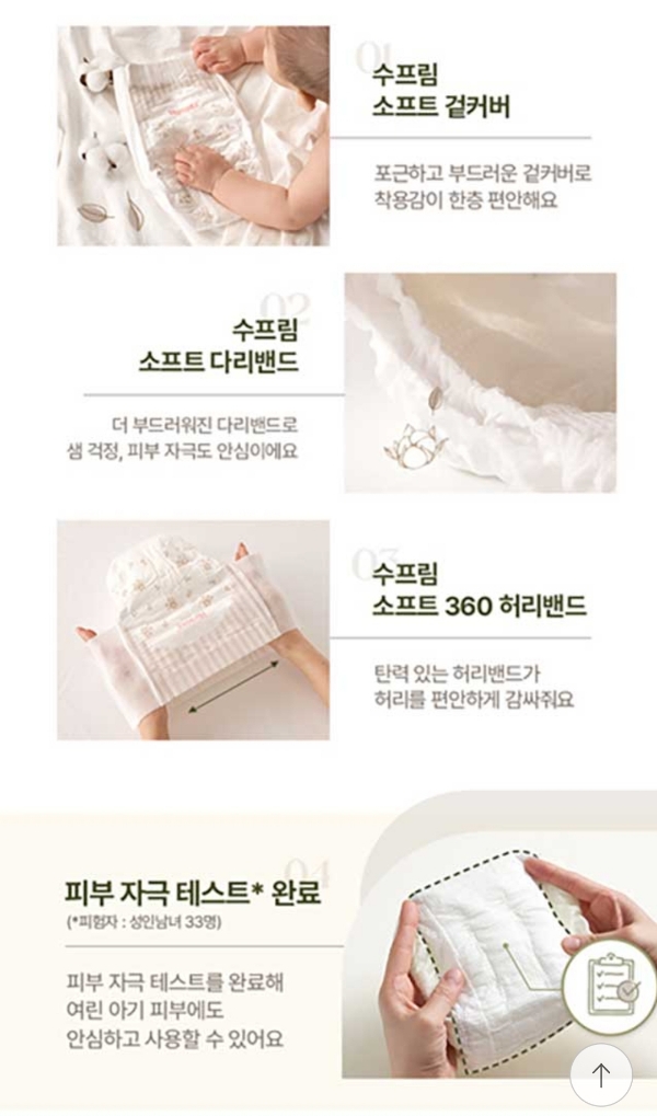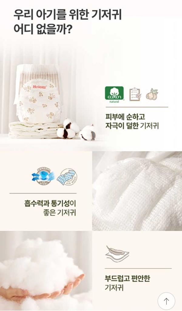 아기 피부에 가장 좋은 것은 순면이겠지요. 순면이 좋다는 건 알지만 천 기저귀는 빨고 삶는 게 너무 힘든 것이 단점이지요. 일회용 기저귀이면서 천기저귀의 장점을 누리고 싶다면 이 제품이 가장 좋은 것 같습니다. 실제로 저희 딸들의 메인 기저귀이기도 합니다. 제가 사용하는 것이기에 자신 있게 추천드려요.