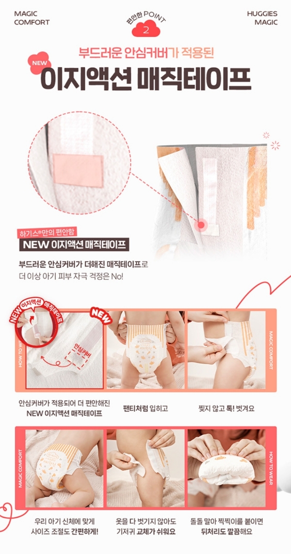 하기스 매직컴포트는 네이처메이드와 유사하지만 착용감에 중점을 둔 기저귀 같습니다. 흡수력과 통기성을 높이고 판테놀과 병풍 함유 로션으로 아기들의 피부를 보호해 줍니다.