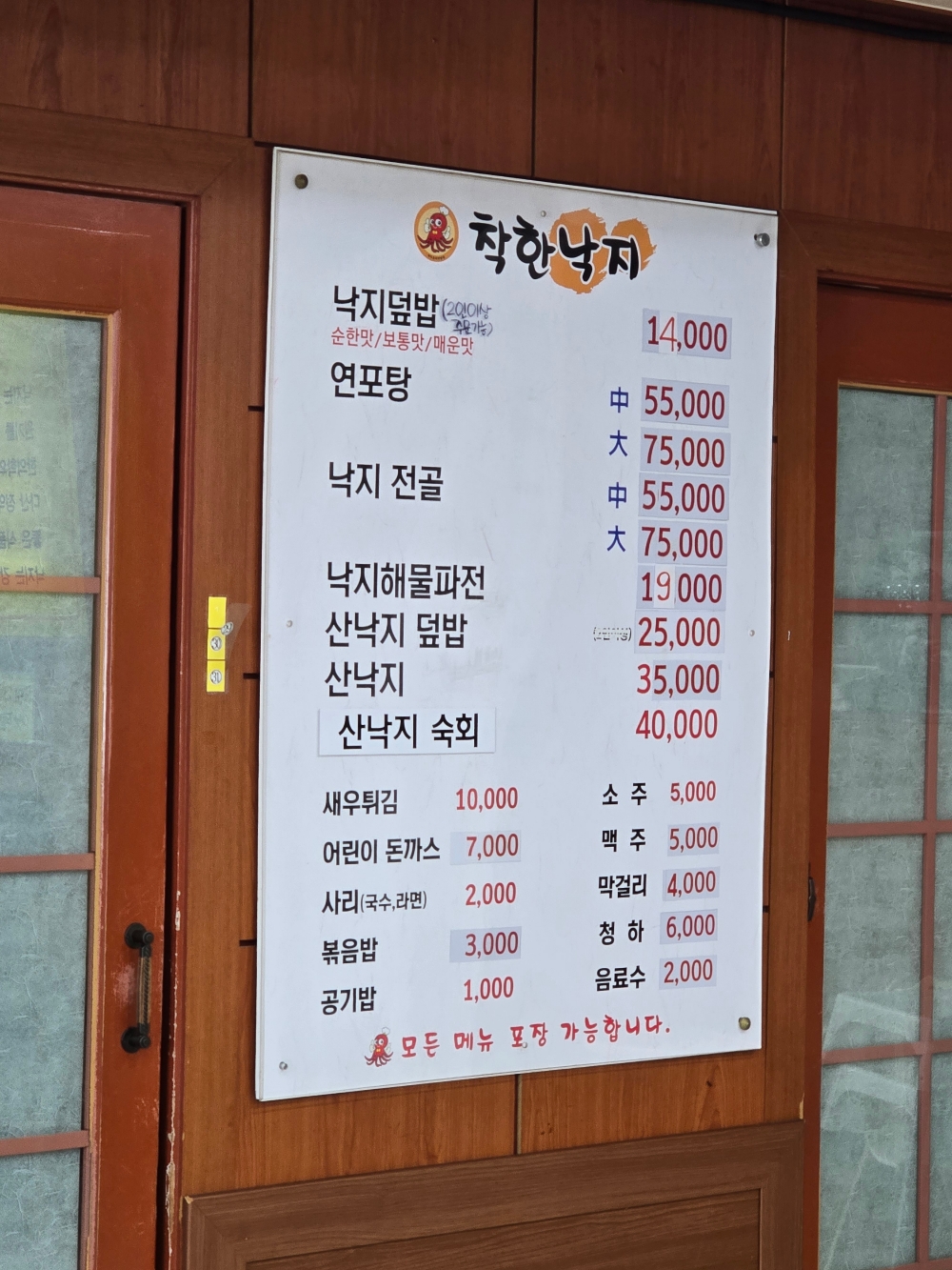 가게 크기에 비해 주차장이 넓진 않지만 대략 10여대 정도 주차가 가능하고, 점심시간에는 길가에도 주차가 가능하기 때문에 이용하시는 데 불편함은 없을 것 같아요. 맛있게 매콤한 음식 드시고 싶다면 착한 낙지 추천합니다.