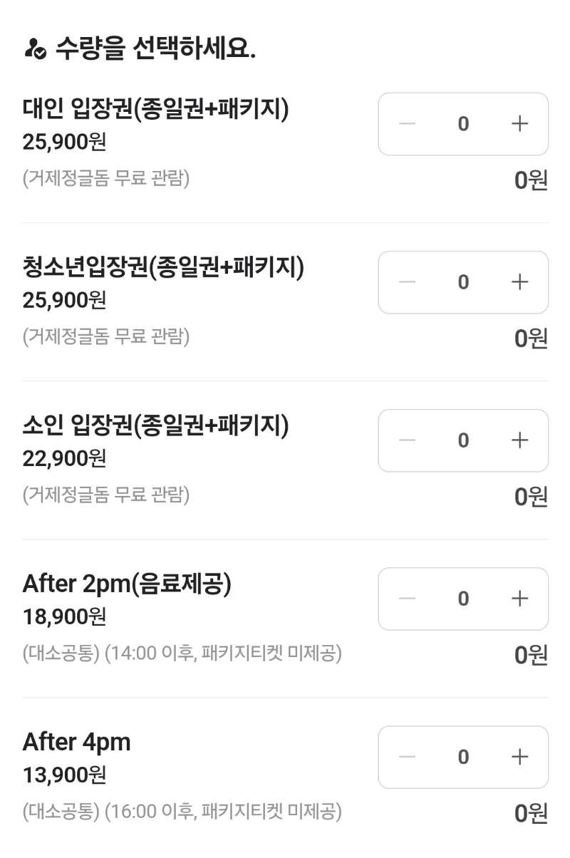 네이버 씨월드+정글돔 패키지를 자세히 보면 2시 이후, 4시 이후 할인 티켓이 있습니다. 타임 할인 상품은 패키지 티켓 미포함 상품인데, 만약 돌고래 공연을 보지 않는다면 할인 시간에 입장하는 것도 좋은 선택지인 것 같아요.
