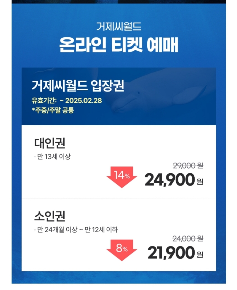 거제 씨월드 입장권은 대인 29,000원, 소인 24,000원, 24개월 미만은 무료입장입니다.