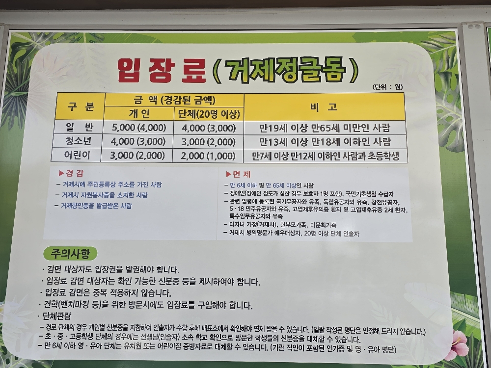 다만 이 때 유의해야 할 사항이 있는데 반드시 거제 씨월드를 먼저 방문하셔야 한다는 것입니다. 거제 씨월드 방문 시 거제 정글돔 입장권을 주는데, 해당 입장권을 가지고 정글돔 매표소로 가서 정글돔 표를 재발행받으셔야 합니다.
