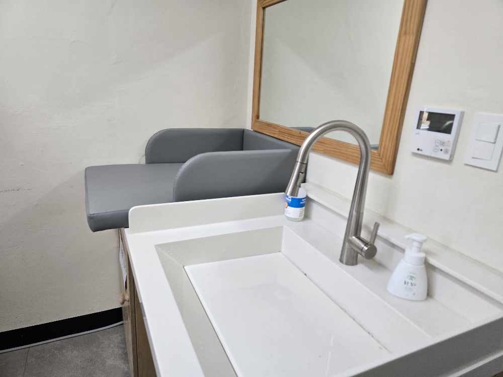 수유실에는 기저귀 갈이대 두 개, 세면대, 전자레인지, 정수기 및 수유하기 좋은 소파가 있었고 가림막으로 둘러싸인 곳도 있어서 프라이빗하게 수유하기 좋아 보였습니다.
