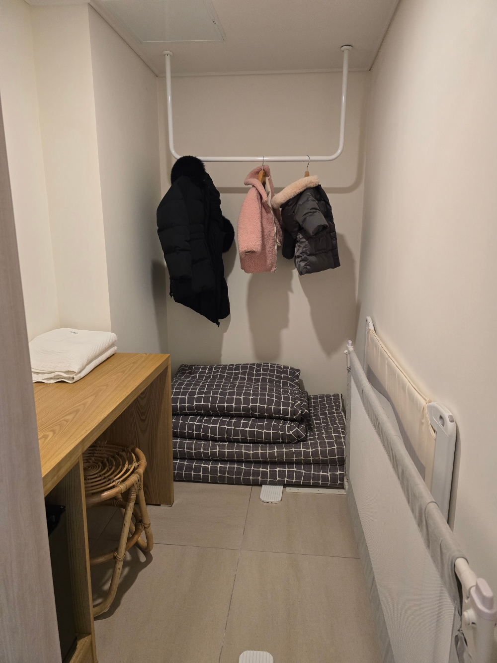 보다시피 현관이 조금 좁아요. 그래서 유모차는 복도에 세워두셔야 합니다. 알파룸에는 드라이기가 있어서 여기서 머리 말리기 좋았어요. 그리고 여기 침대 가드하고 요와 이불이 있어서 아이들을 침대에 재우셔도 되고 저희처럼 바닥에 재우셔도 된답니다.