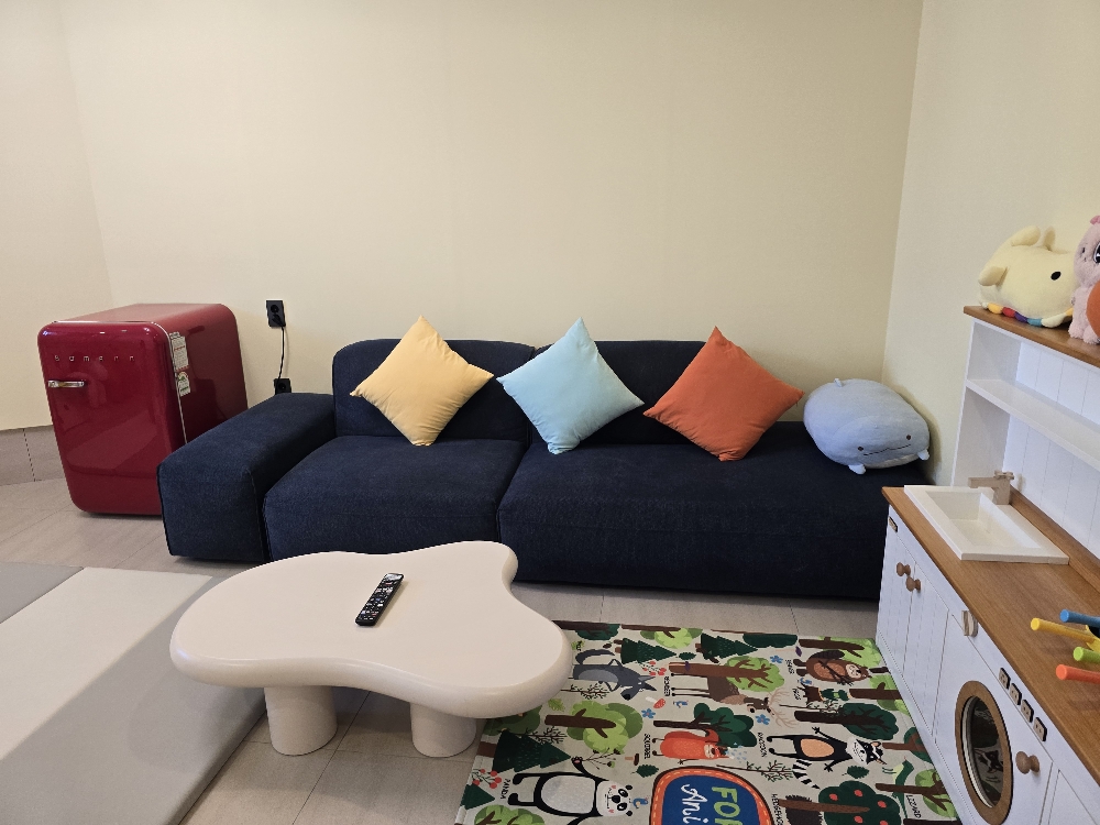 미끄럼틀 외에도 주방놀이를 할 수 있는 공간과 티비를 볼 수 있는 공간, 그리고 마음껏 뛰어놀 수 있는 매트가 있어서 아이를 키우는 부모님들에게 최적의 숙소가 아닐까 생각이 듭니다.