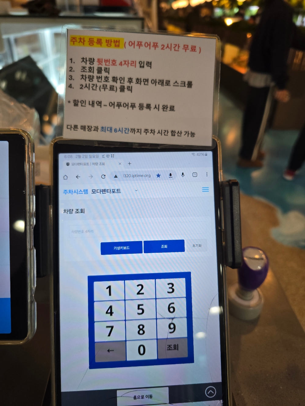 어푸어푸 방문 시 주차는 모다아울렛 지하에 하시면 됩니다. 예전에는 영수증만 보여주면 주차비가 따로 들지 않았는데 최근에 방문해보니 주차등록을 하면 2시간 무료 주차시간을 받을 수 있었습니다.