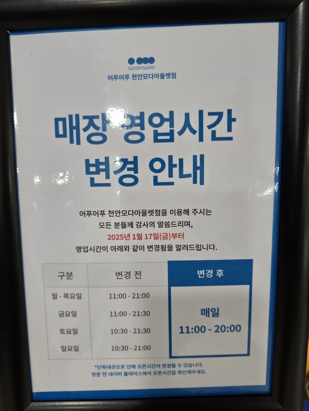 어푸어푸의 매장 영업시간이 25년 1월 17일부터 매일 11시~20시로 변경되었다고 합니다. 오픈시간에 변동이 있을 수 있으니 네이버 검색으로 확인하신 후 방문하시는 것을 추천드려요.