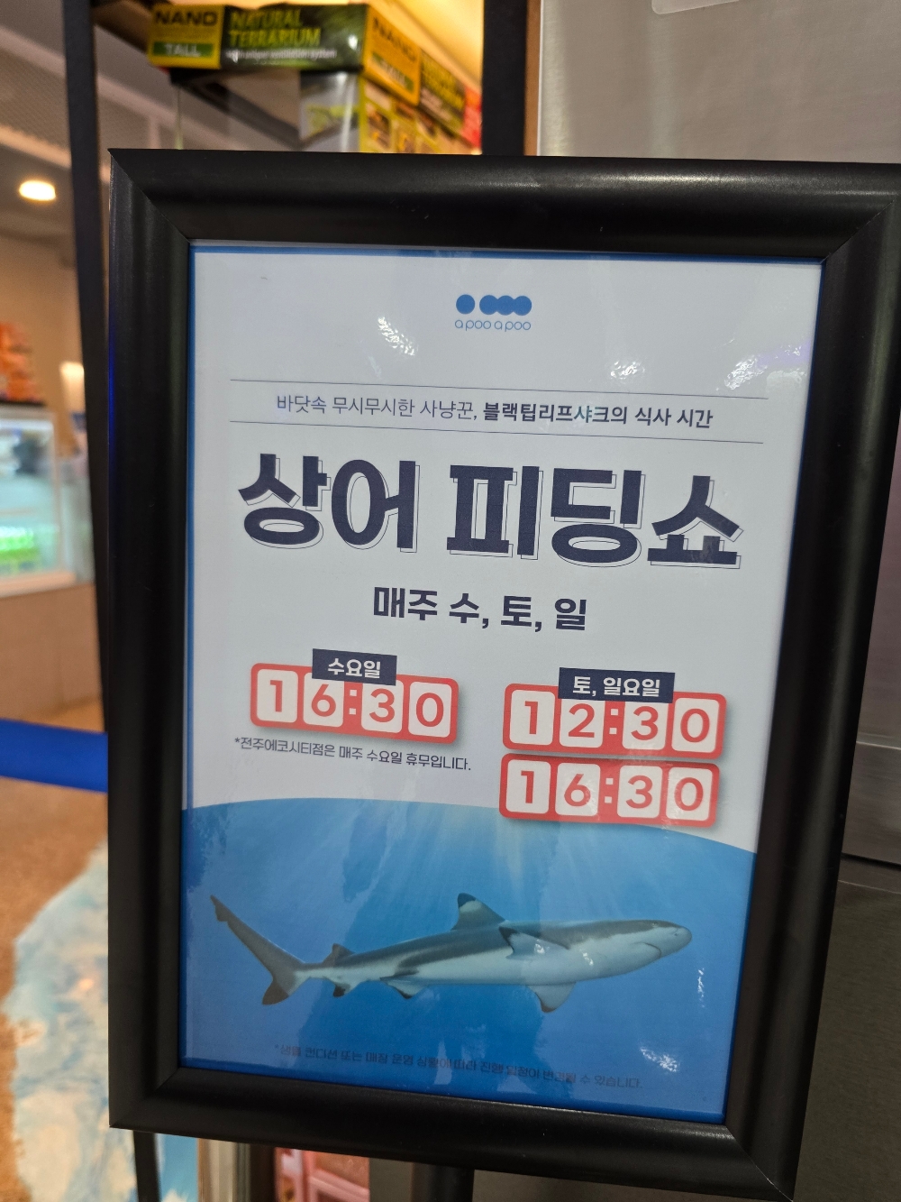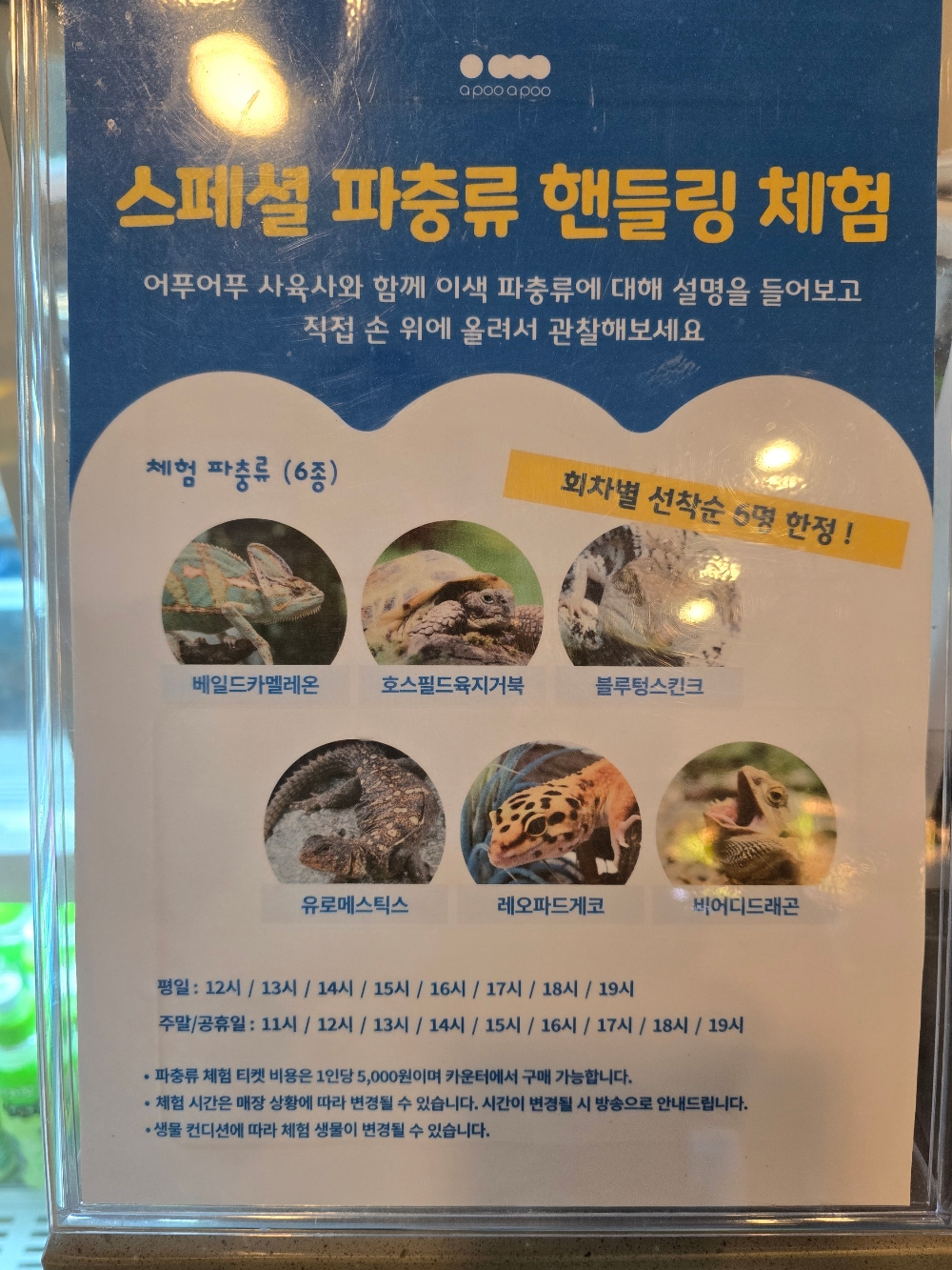 - 특이사항 : 파충류 체험, 상어 먹이주기 체험, 물고기, 물거북, 육지거북 먹이주기 상시 체험 가능