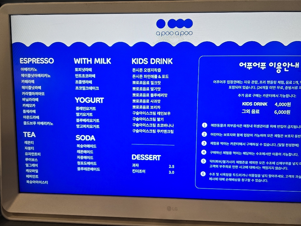 어푸어푸 입장료는 24개월 미만 어린아기를 제외하고는 1인당 1만원(음료 포함)을 받습니다. 여기에 어떤 음료를 선택하더라도 추가금액은 별도로 없기 때문에 취향껏 주문하시면 됩니다.