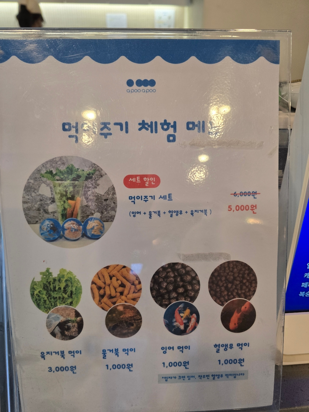제가 느낀 어푸어푸의 장점은 가성비 높은 아쿠아리움 + 먹이주기 체험이 상시 가능하다는 점이예요. 접근성이 좋고 커피도 한 잔 할 수 있다는 점은 덤이고요. ^^