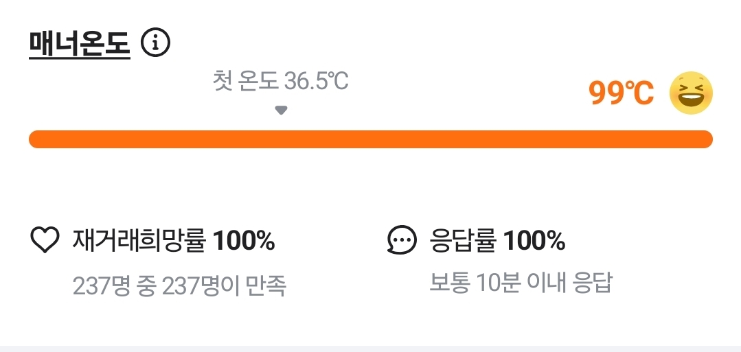 왜냐면 1월까지만 해도 당근온도가 45도 내외였던 걸로 기억하는데 당근에서 판매, 구매를 자주 하다 보니 어느 순간 6개월 만에 99도를 찍었더라고요.