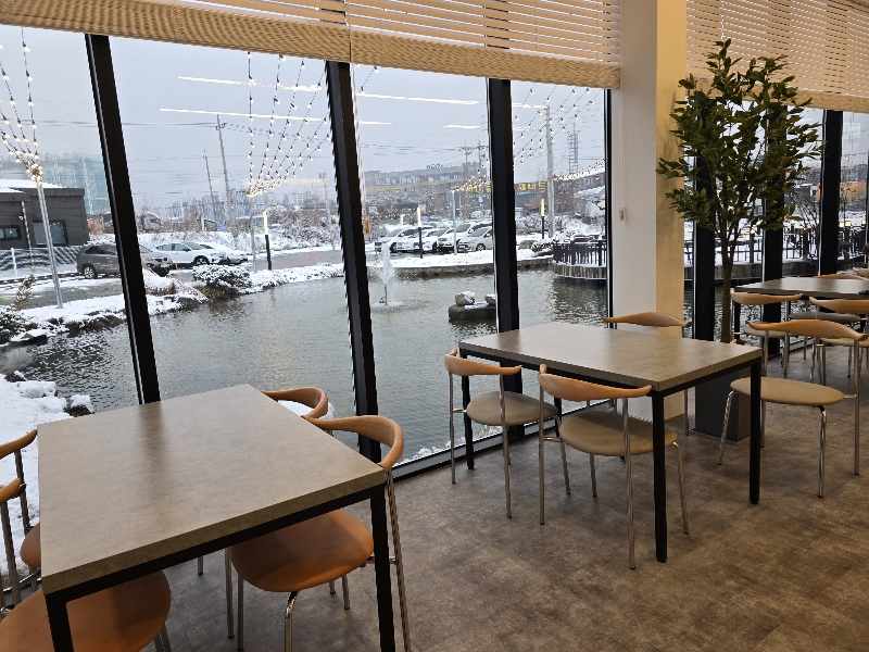 주변이 논이라 그런지 교외로 나온 느낌이 물씬 났어요. 때마침 눈이 온 날이라 더 경치가 좋았어요.