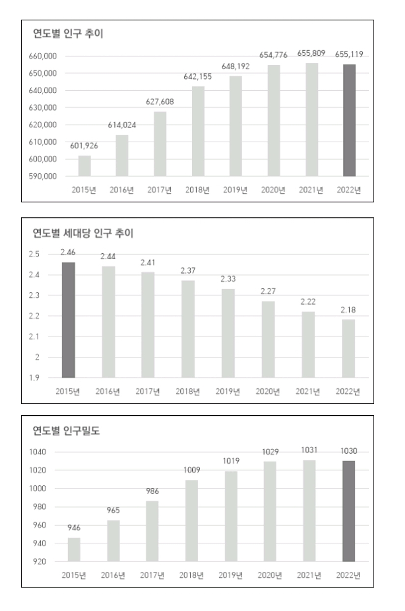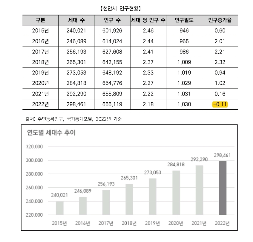 2022년 천안시의 총인구는 655,119인으로 충청남도에서 차지하는 비중이 약 31%입니다. 최근 세대당 인구수는 감소하는 추세이며, 2015년부터 2021년까지 인구가 꾸준히 증가하였으나 2022년에 한풀 꺾이는 양상을 보입니다.