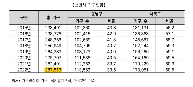 가구수는 꾸준히 증가해왔으며, 서북구 증가율이 동남구에 비해 높습니다.