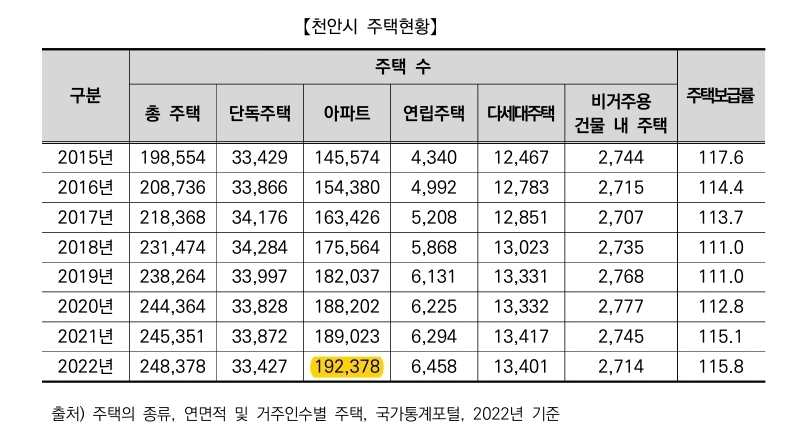 천안시 주택 보급률은 2022년 기준 115.8이며, 아파트가 대다수를 차지하고 있습니다.