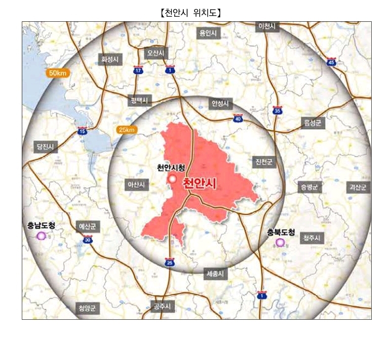 천안은 동측으로는 청주시, 진천군과 인접해 있으며, 서측은 아산시, 남측은 공주시, 세종시, 북측은 경기도 평택시 및 안성시와 경계를 이루고 있습니다. 또한 천안은 서울로부터 83.6km 떨어져있어 수도권의 배후와 충남 지역의 관문으로서 교통의 요충지로 자리잡고 있습니다.