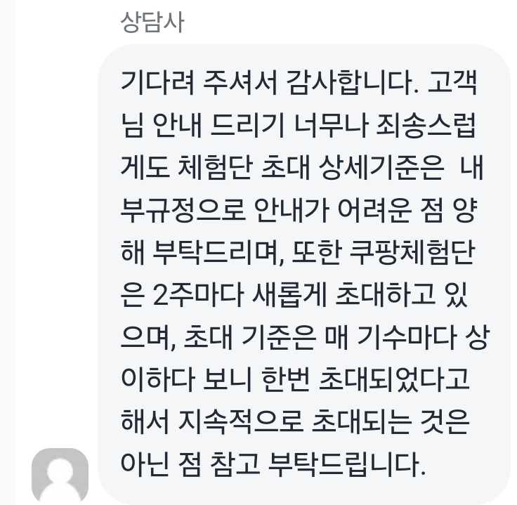 방금 쿠팡에 문의해보니 쿠팡 체험단 초대 상세기준은 내부규정으로 안내가 어려우며, 초대 기준이 매 기수마다 상이하다 보니 한번 초대되었다고 해서 지속적으로 초대되는 것은 아닌 점 참고해달라는 답변을 받았습니다.