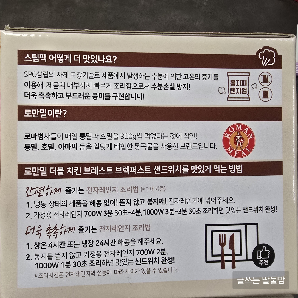 그리고 1000W 전자레인지의 경우 3분이라고 되어 있는데 저희 집 전자레인지로 3분 돌렸더니 빵이 너무 딱딱해지더라고요. 그래서 2분으로 했더니 촉촉하게 잘 데워졌어요. ^^ 전자레인지마다 다르니 한 번 해보고 조절해보시길 바라요.