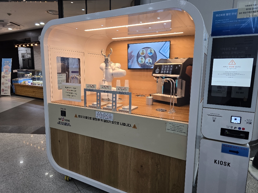 1층 카페 앞 커피 만드는 로봇입니다. 정말 신기하더라고요. 1층 카페에서 사용하는 커피컵은 보증금 1천원을 내고 이용해야 하는 시스템이었습니다. 카페 앞에 보면 보증금 반환 기계가 있어서 다 마신 컵을 반환할 수 있었습니다. 어렵지 않았어요. 처음 커피값 계산은 카드로 했는데 컵 보증금은 현금으로 받았습니다.