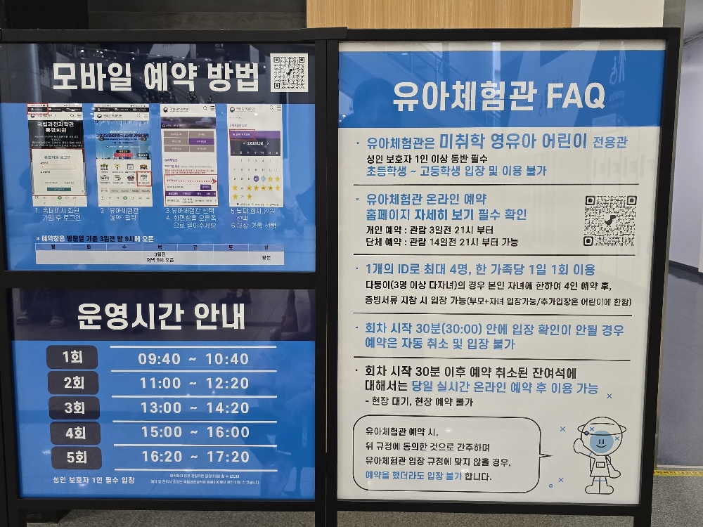 유아체험관은 예약이 필수입니다. 예약을 하지 못하면 당일 입장이 거의 불가능하다고 보시면 됩니다. 간혹 회차 시간 30분 뒤에 미입장 고객이 있는 경우 들어갈 수 있지만 체험시간이 너무 짧아 아쉽기 때문에 저는 꼭 예약을 하시는 것을 추천드립니다. 유아 체험관은 미취학 영유아 어린이 전용관으로 반드시 성인보호자 1인 이상 동반해야 합니다.