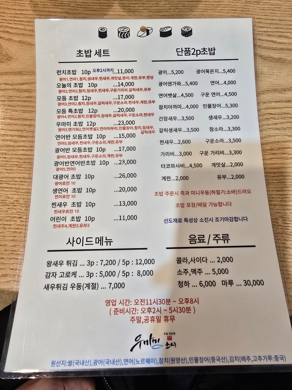 가격이 조금 비싼 편이예요. 런치초밥은 11,000원으로 가성비가 좋지만 가장 비싼 우마미초밥은 23,000원으로 런치초밥의 두 배 이상의 가격이에요. 저는 연어, 광어를 즐기는 편이라 모듬 특초밥이나 우마미초밥을 시켜 먹는데 오늘은 특초밥을 먹었어요. 여기는 아기가 먹을만한 메뉴는 없어요. 아기 의자도 본 적 없고요. 아이들 없이 어른들끼리만 오는 걸 추천드려요.