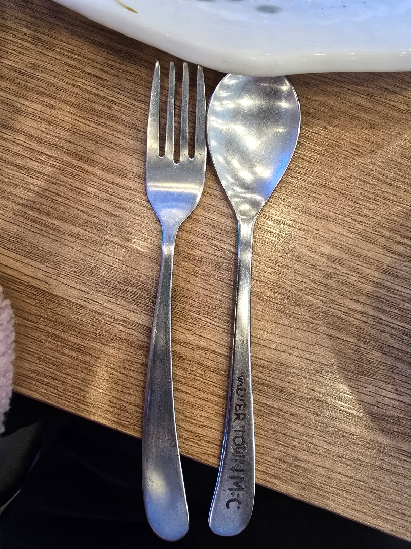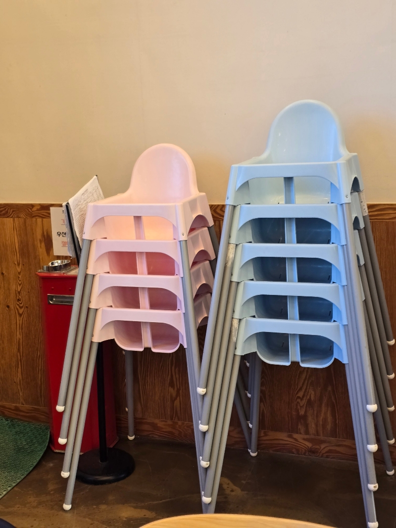 아기 의자 저렇게 많이 쌓여있는거 보신 적 있으신가요? 어떤 곳은 아기의자가 모자라서 못 앉는 경우도 간혹 있는데 이 집은 아기의자가 차고 넘칩니다. 아기 수저도 깔끔하고 위생적인 스테인리스입니다.