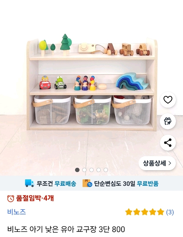 책을 구매하면서 함께 구매한 교구장입니다. 이후 아이들 장난감과 책이 늘기 시작하면서 지금은 창가 한 면을 이 교구장으로 가득 채우게 됐는데 아이들 눈높이에 딱 맞고 다양한 수납이 가능해서 무척 만족하며 사용하고 있습니다. 가격대도 높지 않고 내구성도 좋습니다. 지금 4년째 사용하고 있는데 너무 좋아요. 저 바스켓도 함께 구매했는데 사이즈가 딱 맞아서 물건 정리하는 용도로 너무 좋습니다. 당시에 바스켓을 9개나 사다 보니 가격이 부담스러워서 사지 말까 고민도 했었는데 너무너무 잘 활용하고 있습니다.