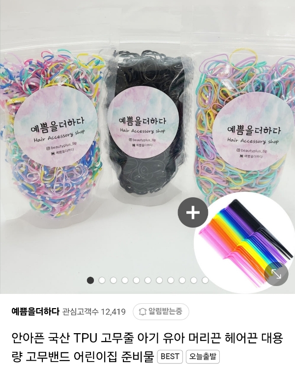 우선, 고무줄이 잘 늘어나서 머리 묶기 너무 편해요. 그렇다고 해서 헐겁지도 않고 하루종일 잘 유지해 줍니다. 그리고 머리카락이 엉키지 않아서 아이들도 편해해요. 고무줄 유목민들 꽤 계실 텐데 저는 이 집 유아고무줄 추천합니다.