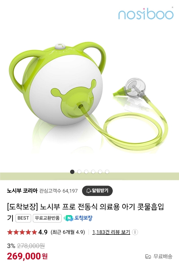 큰 소리에 아이들이 놀라고 갑자기 무언가가 빨아들이는 느낌 때문에 저희 딸들은 둘 다 거부감이 무척 심했는데, 요즘 첫째는 조금 컸다고 자기 스스로 콧물을 빼기도 합니다. 아기들은 스스로 코를 풀 수 없기 때문에 감기에 한 번 걸리면 정말 밤새 코가 막히고 콧물이 흘러서 너무 힘들어하는데 이 노시부가 많은 도움이 됐습니다.